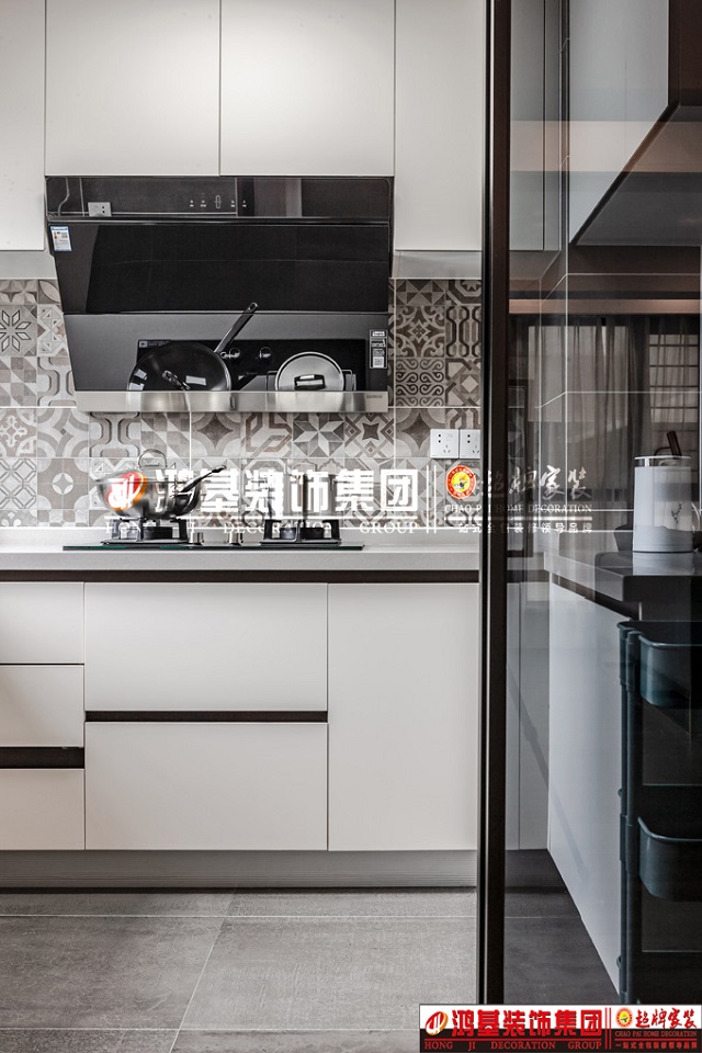 圖8.亮點:廚房采用當(dāng)下流行的極窄推拉門透明玻璃的設(shè)計,墻面采用花磚設(shè)計,拒絕平庸,使整個空間充滿時尚感。